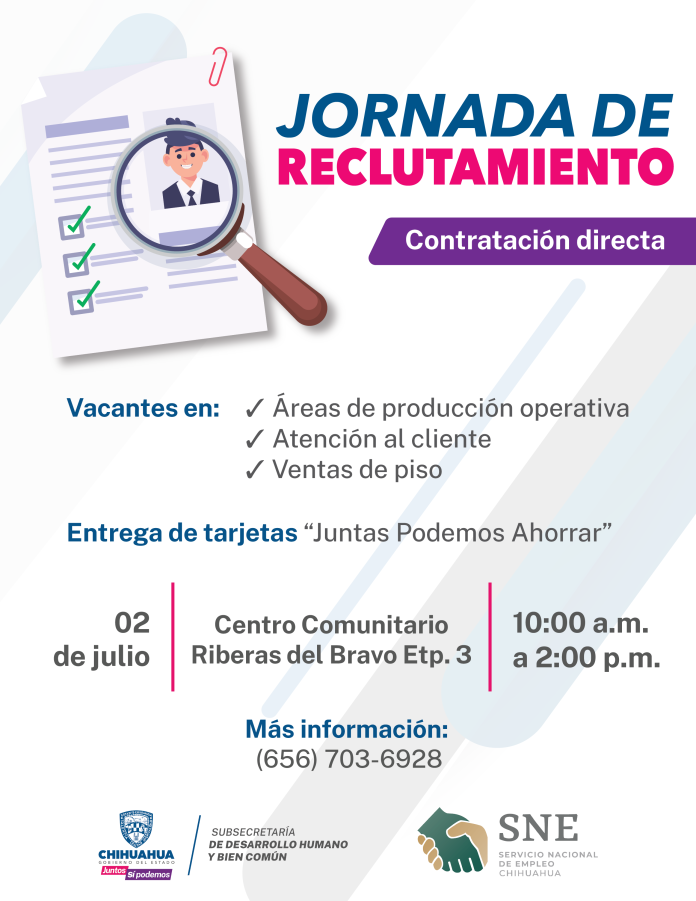 Ciudad Juárez, Chih .- Con el propósito de impulsar la economía de los sectores vulnerables de la frontera, el Gobierno del Estado, a través de la Subsecretaría de Desarrollo Humano y Bien Común, en coordinación con el Servicio Nacional de Empleo, convoca a la “Jornada de Reclutamiento”, en la colonia Riberas del Bravo Tercera Etapa.