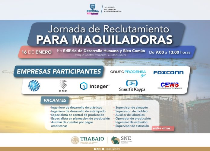 Ciudad Juárez, Chih .- Gobierno del Estado, a través de la Secretaría del Trabajo y Previsión Social (STPS) y del Servicio Estatal de Empleo, invitan a participar este próximo lunes 16 de enero en la Jornada de Reclutamiento enfocada al sector manufacturero.