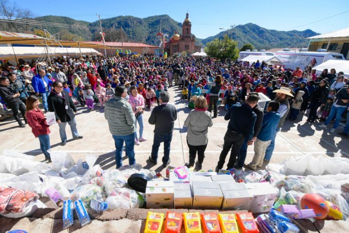 Chihuahua, Chih .- Durante el festejo se realizó la entrega de 360 paquetes de 27 kilogramos (kg) de maíz, 360 paquetes de 9 kg de frijol, 500 juguetes, 800 paquetes de 5 kg de arroz, 800 paquetes de 5 kg de frijol, 50 piñatas, 500 despensas, 1200 chamarras.