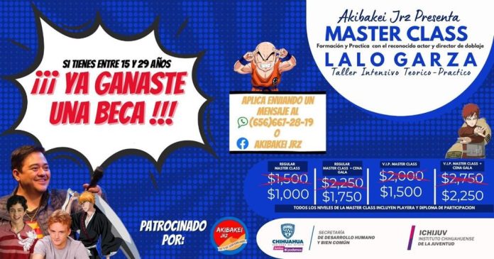 Se trata de una Masterclass de formación y práctica que desarrollará, Lalo Garza, reconocido actor y director de doblaje, quien llega a las instalaciones del Parque Central a las 18:00 horas, por medio de la organización Akibakey Juárez.