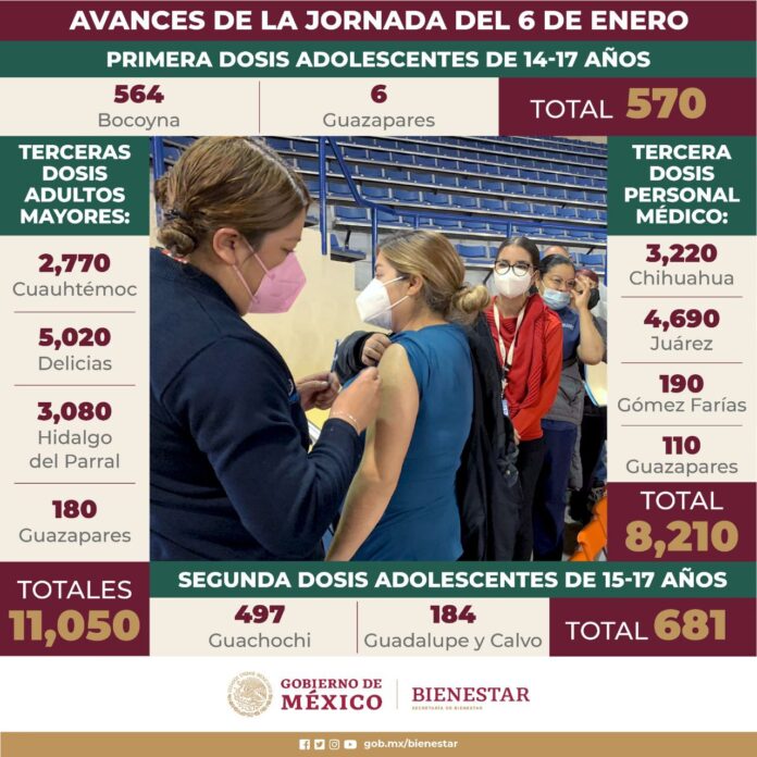 Chihuahua, Chih. (ADN / Martín Orquiz) – Durante la jornada de vacunación contra el COVID-19 realizada el 6 de enero, la Secretaría de Bienestar reportó que se inmunizó a 11 mil 050 adultos de 60 años y mayores con la dosis de refuerzo, a 570 adolescentes de los 14 a 17 años con la primera aplicación, a 681 con la segunda a personas de 15 a 17 años y a 8 mil 210 con la tercera a personal médico.