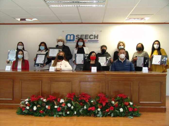 Chihuahua, Chih .- En reconocimiento a sus labores en apoyo a las actividades educativas en favor de docentes y estudiantes del estado, Servicios Educativos del Estado de Chihuahua (SEECH) entregó diplomas y relojes conmemorativos a personal de Apoyo y Asistencia a la Educación, por su trayectoria de 30 a 50 años de servicio.