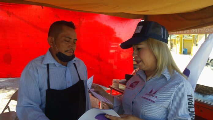Ciudad Juárez, Chih. – Entre monos de peluche, utensilios de cocina, ropa nueva y usada, recorrió esta mañana, la candidata a Presidenta por el PES, Marisela Sáenz, los puestos de mercancía y saludo tanto a compradores, como a vendedores, con quienes intercambio sus propuestas