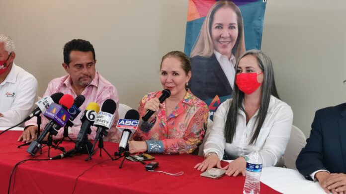 En conferencia de prensa, la candidata a la Alcaldía Adriana Fuentes estuvo flanqueada por el dirigente municipal del tricolor y el resto de los candidatos.