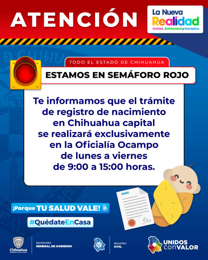 Chihuahua, Chih. – El Registro Civil del Estado informó que con el objeto de evitar la concentración de personas en sus oficinas, los registros de nacimientos en Chihuahua capital se realizarán únicamente en la Oficialía Ocampo.