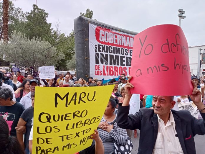 Chihuahua, Chih (ADN/Adriana Saucedo ) Los diputados de morena se manifestaron junto con padres y madres de familia, así como maestros que marcharon para exigir a la gobernadora María Eugenia Campos Galván, no detenga la entrega de los Libros de Texto Gratuitos en las escuelas públicas del estado.