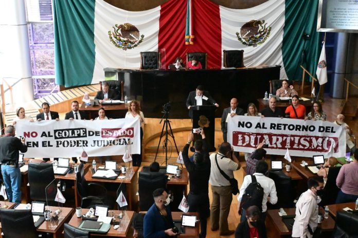 “No al retorno del Duartismo” “No al golpe de estado en el poder judicial” fueron las frases en las pancartas con las que los legisladores y legisladoras se posicionaron.