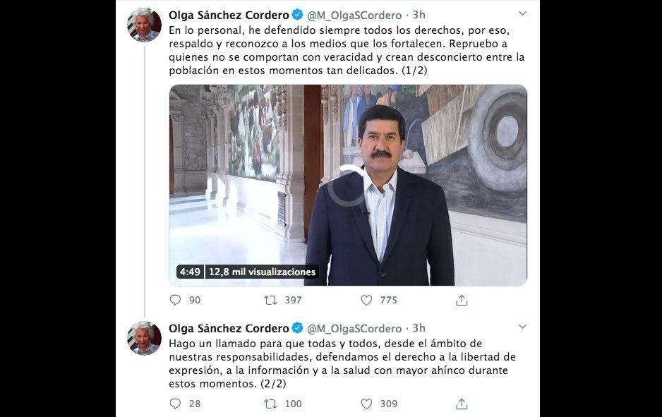 “Hago un llamado para que todas y todos, desde el ámbito de nuestras responsabilidades, defendamos el derecho a la libertad de expresión, a la información y a la salud con mayor ahínco durante estos momentos”, agregó Sánchez Cordero en una segunda publicación.