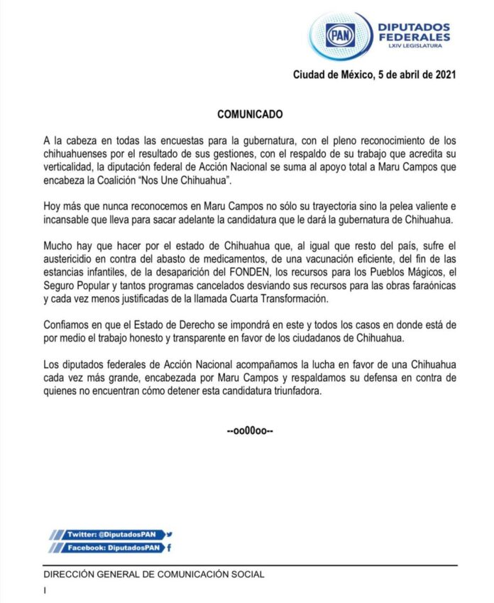 “A la cabeza en todas las encuestas para la gubernatura, con el pleno reconocimiento de los chihuahuenses por el resultado de sus gestiones, con el respaldo de su trabajo que acredita su verticalidad, la diputación federal de Acción Nacional se suma al apoyo total a Maru Campos que encabeza la Coalición “Nos Une Chihuahua”.