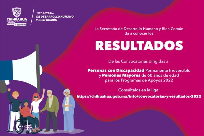 Chihuahua, Chih .- Con el objetivo de mejorar las condiciones de vida de los sectores vulnerables de la población, el Gobierno del Estado por medio de la Secretaría de Desarrollo Humano y Bien Común (SDHyBC), dio a conocer hoy los resultados de las convocatorias en programas de Apoyo a Personas Mayores y a Personas con Discapacidad 2022.