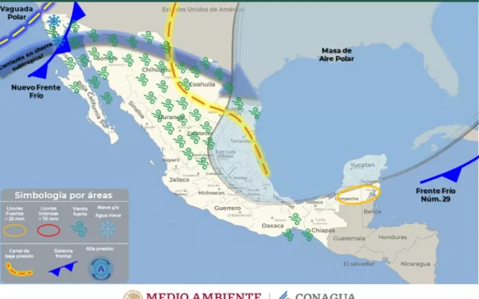 Mientras para este próximo miércoles 16, el frente frío número 30 se ubicará al noroeste del país en interacción con una vaguada polar, la corriente en chorro y una línea seca sobre Coahuila favorecerá a la presencia de fuertes rachas de viento que pueden alcanzar hasta los 85 y 95 km/h.