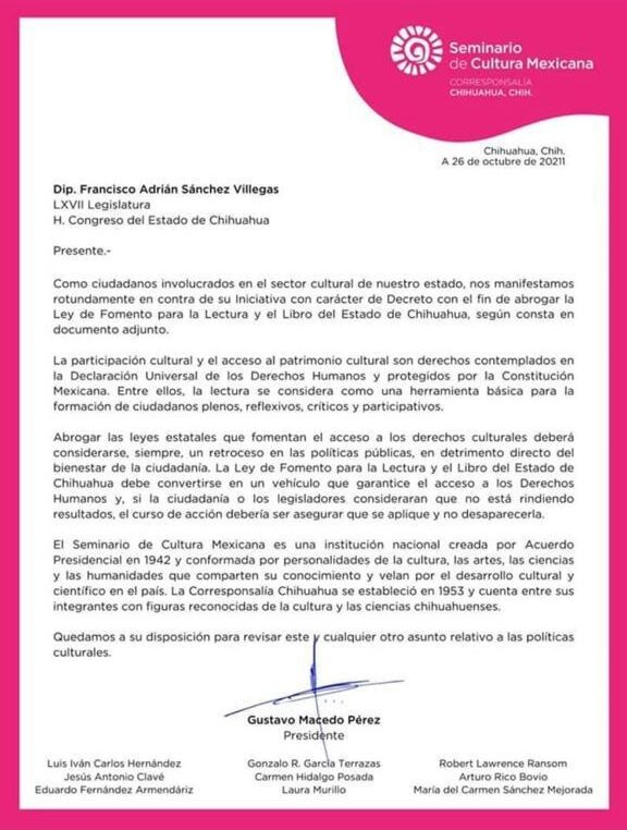 Chihuahua, Chih. (ADN / Martín Orquiz) – A través de una carta pública, integrantes de la corresponsalía Chihuahua del Seminario de Cultura Mexicana expresaron su postura en contra de la propuesta presentada por el diputado de la LXVII legislatura del Congreso local por Movimiento Ciudadano, Francisco Adrián Sánchez Villegas, para abrogar La ley de Fomento para la Lectura y el Libro del Estado de Chihuahua.
