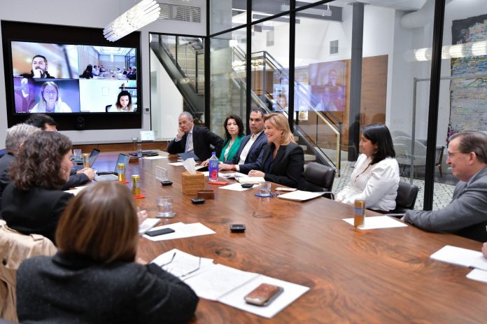 Chihuahua, Chih .- En el marco de la gira que realiza por la ciudad de Washington, D.C., Estados Unidos, la gobernadora Maru Campos sostuvo una reunión de trabajo con integrantes y destacados representantes de organismos e instituciones que trabajan para generar mejores prácticas en temas migratorios relacionados con la contención y prevención como: Emerson Collective, America’s vocie y la Organización de los Estados Americanos (OEA), entre otros.