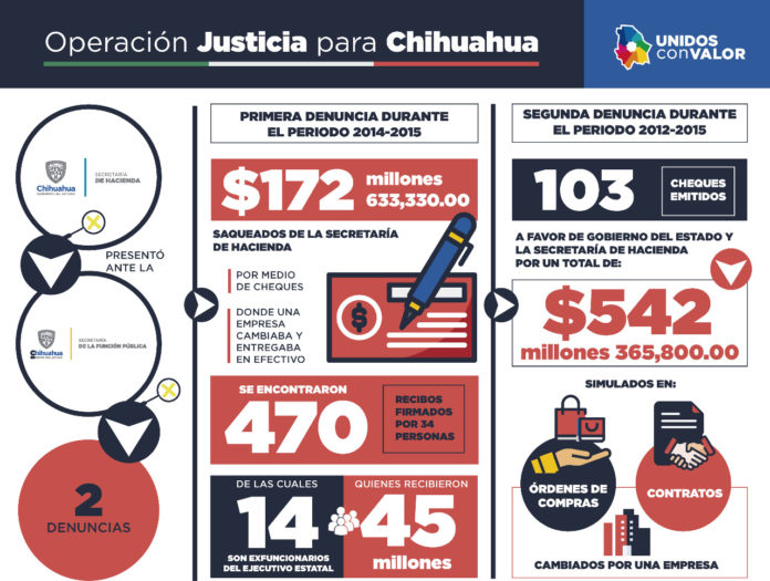 Chihuahua, Chih. – En el marco de la Operación Justicia para Chihuahua, se detectó que en los ejercicios fiscales del 2012 al 2015 de la administración estatal, se emitieron 103 cheques a favor del Gobierno del Estado y/o Secretaría de Hacienda, por un total de 542 millones 365 mil 800 pesos, informó la secretaria de la Función Pública, Mónica Vargas Ruiz.