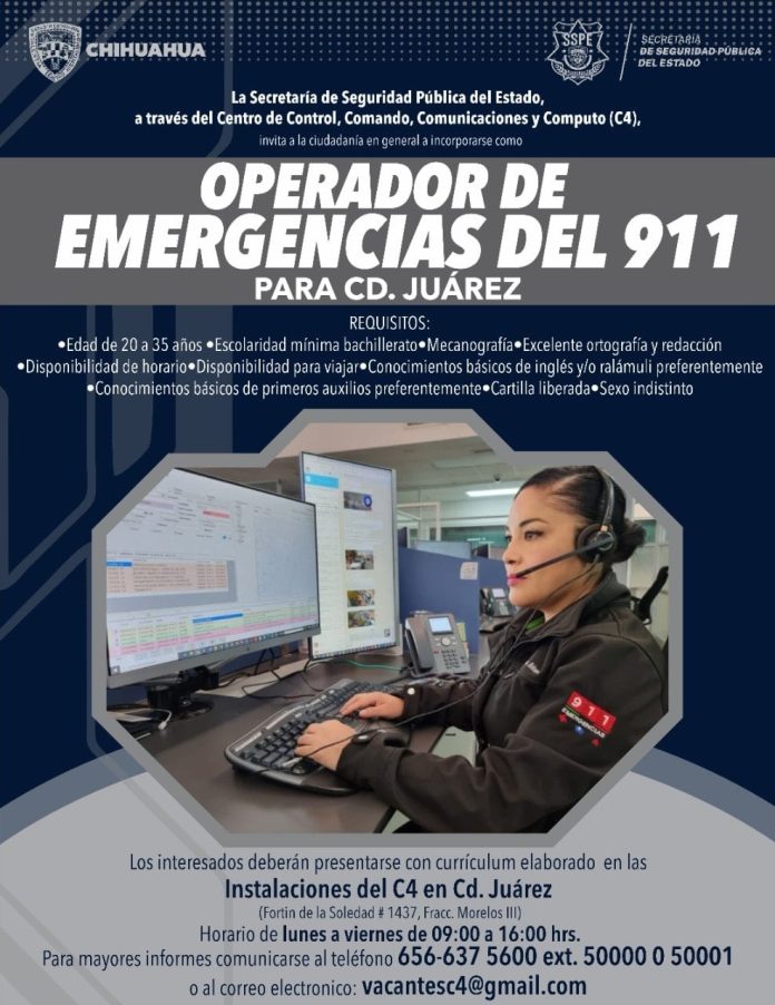 La Secretaría de Seguridad Pública del Estado (SSPE), a través de Centro de Control, Comando, Comunicaciones y Computo (C4), invita a la ciudadanía de Ciudad Juárez a incorporarse como operador de la línea de emergencias del 9-1-1.