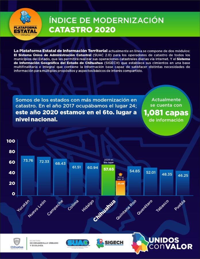 Chihuahua, Chih. – El estado de Chihuahua se posicionó como uno de los estados con más modernización en catastro, al colocarse en sexto lugar a nivel nacional informó el gobernador Javier Corral Jurado al dar a conocer la medición de la Plataforma Estatal de Información Territorial.