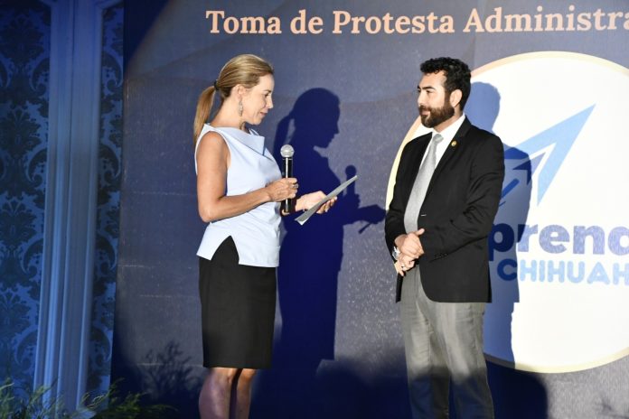 Chihuahua, Chih .- La titular de la Secretaría de Innovación y Desarrollo Económico (SIDE), Manque Granados Trespalacios, encabezó la ceremonia de toma de protesta de Ricardo Bustos como nuevo presidente de la Red Emprende Chihuahua.