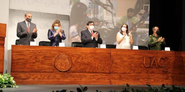 Durante su mensaje, González Mocken reconoció la importancia de la UACJ como factor de alianza entre los diversos sectores de la población y llamó a la comunidad universitaria a sumarse en este esfuerzo.