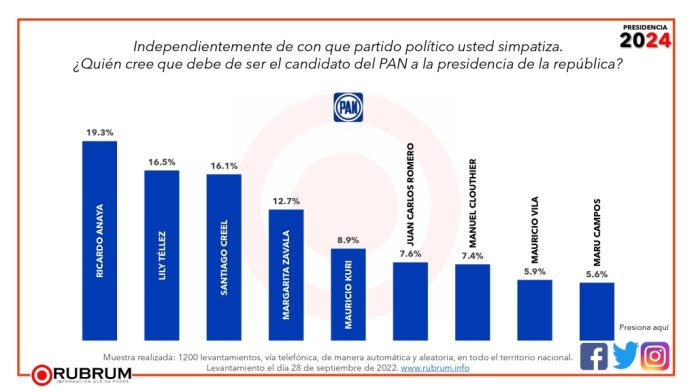 De acuerdo a Rubrum, la encuesta se llevó a efecto el pasado 28 de septiembre en todo el territorio nacional, con una metodología de llamadas telefónicas de mil 200 en total, las cuales se inclinaron en favor de Ricardo Anaya con el 19.3%, mientras que Maru Campos, fue favorecida con el 5.6%.