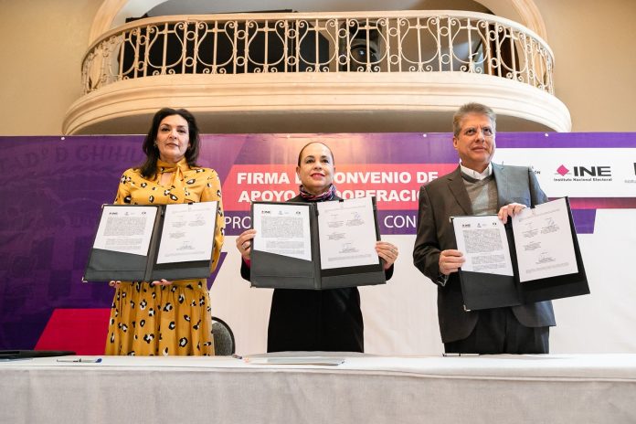 Chihuahua, Chih .- La Secretaría de Educación y Deporte (SEyD) firmó un convenio de colaboración con el Instituto Nacional Electoral (INE) y el Instituto Estatal Electoral de Chihuahua (IEE), para la utilización de 2 mil 120 planteles educativos en el Proceso Electoral Concurrente 2023-2024.