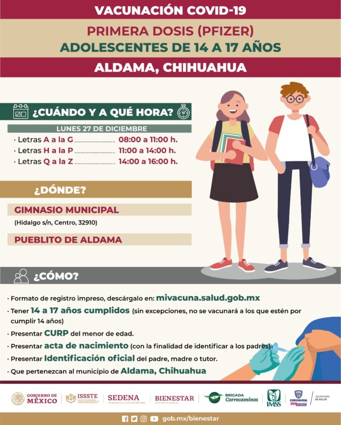 Los requisitos que deben presentar son el registro impreso de mivacuna.salud.gob.mx, tener 14, 15, 16 y 17 años cumplidos sin excepciones, CURP, acta de nacimiento e identificación oficial del padre, madre o tutor que los acompañe y deben habitar en este el Municipio de Aldama.