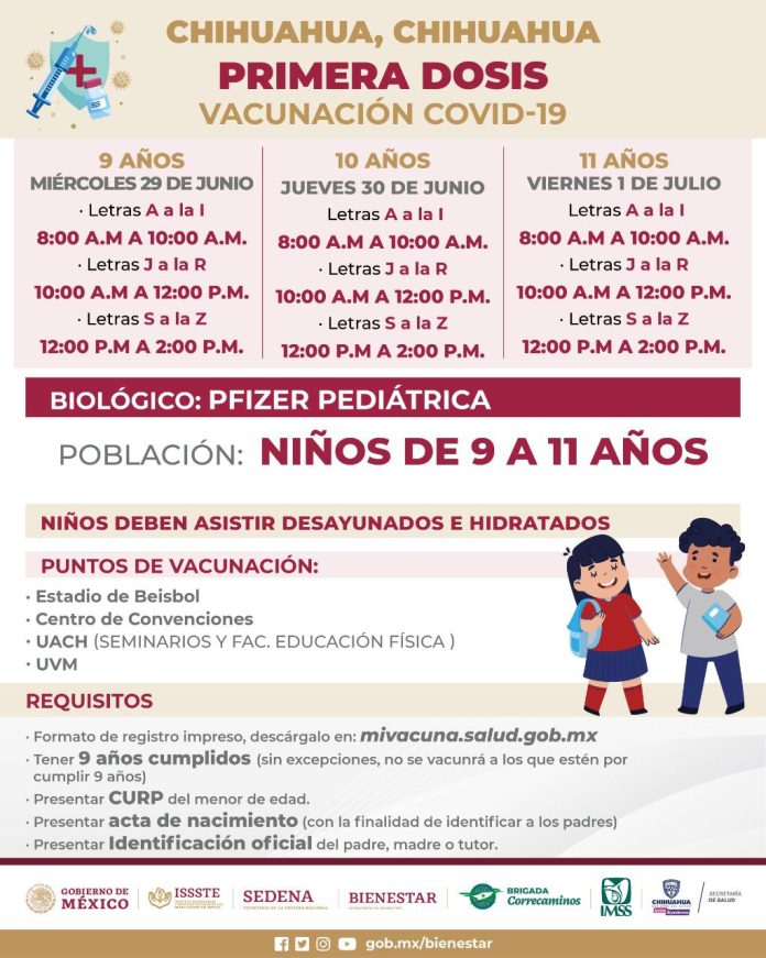 Chihuahua, Chih. (ADN / Martín Orquiz) – A partir de mañana y hasta el próximo viernes, se llevará a cabo en la Ciudad de Chihuahua el primer operativo de vacunación para infantes de 9, 10 y 11 años, informó la Secretaría de Bienestar a través de un comunicado.