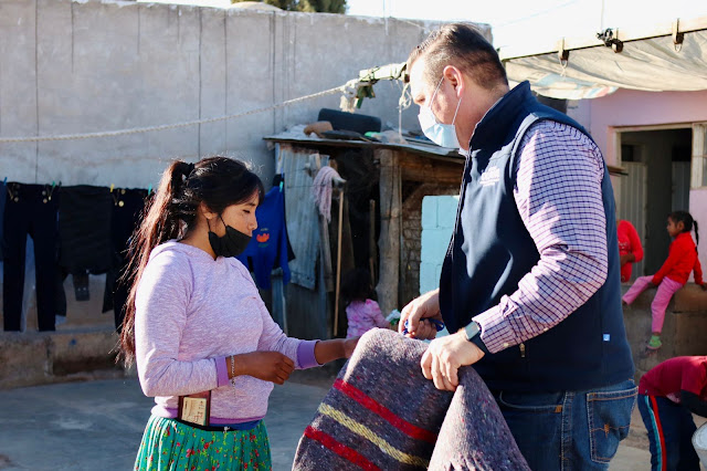 Chihuahua, Chih. – En su visita entregó apoyos para los residentes del asentamiento, para que puedan pasar un invierno más cómodo.