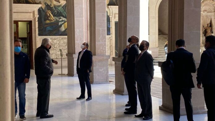 Chihuahua, Chih (ADN/Arturo Hernández).- El expresidente del Senado de la República, Ernesto Cordero Arroyo, recorrió las instalaciones del Palacio de Gobierno, en compañía de sus principales colaboradores, y a quienes se les explicó el sentido de los murales en donde se muestra la historia resumida del Estado desde el siglo XVI hasta la Revolución Mexicana.