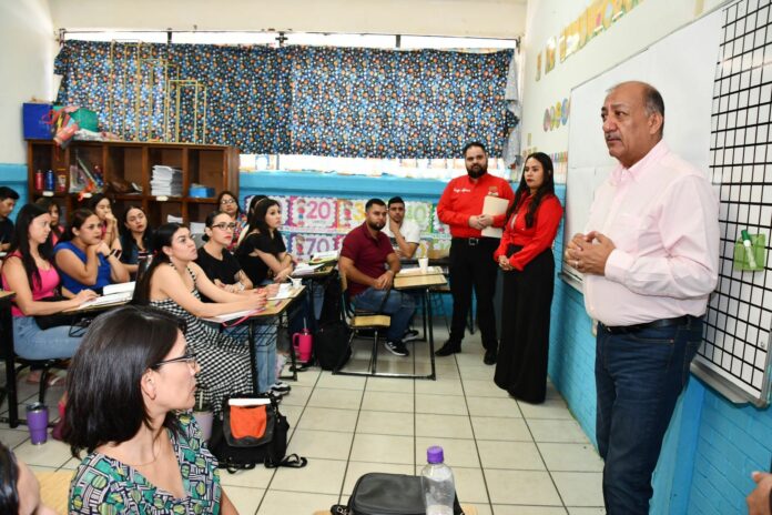 Chihuahua, Chih .- Como parte de la Fase Intensiva del Consejo Técnico Escolar, el secretario de Educación y Deporte, Francisco Hugo Gutiérrez Dávila, visitó algunos planteles de la región centro-sur del estado, donde intercambió puntos de vista con docentes de primaria y secundaria.