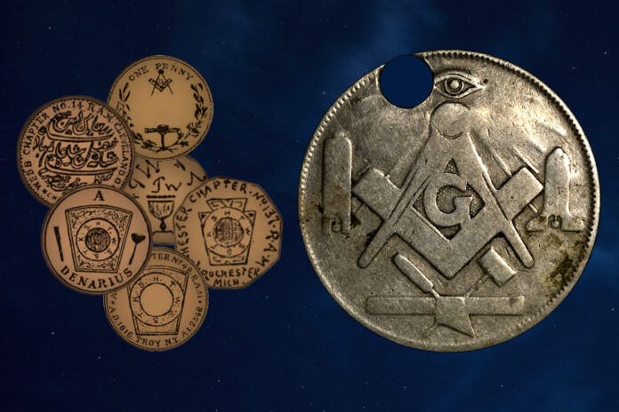 Una de las tradiciones masónicas reveladas a través del caso Morgan fue el uso de monedas de “Capítulo” o de “Marca” (Wright, 7). Los masones usaban estas fichas como un sistema de identificación para sus miembros. Hechas a medida para cada logia masónica, estos medallones se presentaban a los nuevos hermanos en su iniciación y representaban su aceptación y participación en la hermandad masónica. Los nuevos hermanos grababan sus marcas en las monedas.