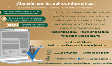 El IDPR indicó que los interesados en participar en cualquiera de las subastas que organiza que deben hacerlo únicamente en el link subastas.indep.gob.mx y no caer en el engaño de delincuentes cibernéticos, cuyos fraudes van en aumento.
