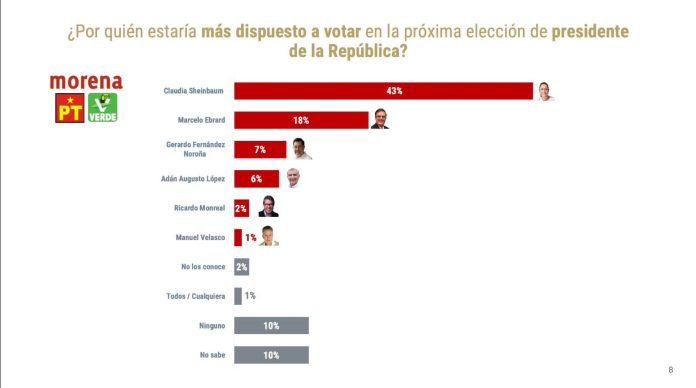 Finalmente y en el rubro de quién preferiría el presidente de la República para ser el abanderado de la Alianza Morena-PT-Partido Verde, Claudia Sheinbaum alcanza el 40% frente a sólo el 17 de Marcelo Ebrard. Lo anterior en tanto que el propio presidente Andrés Manuel López Obrador alcanza una aprobación del 77% y Morena un 51% como el partido por el que más se identifica la gente.