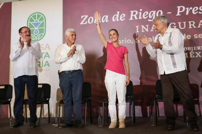 El Rosario, Sinaloa .- Con obras para impulsar y fortalecer el campo, el estado de Sinaloa va a seguir reforzando su esencia como un estado productor de alimentos, aseguró la Presidenta Electa de México, Claudia Sheinbaum Pardo, tras acompañar al Presidente Andrés Manuel López Obrador en la entrega de una zona de riego de la presa “Santa María”, en el municipio de El Rosario.
