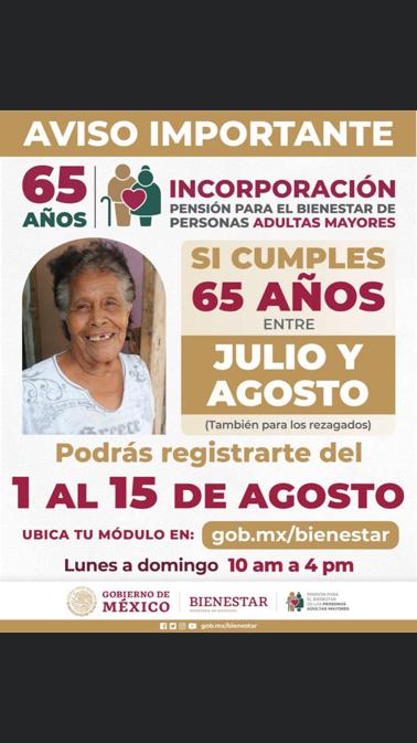 A través de sus redes sociales, dio a conocer que también las personas que sean mayores de 65 años, y que no se han registrado en el programa, podrán hacerlo en esta oportunidad del primero al 15 de agosto.