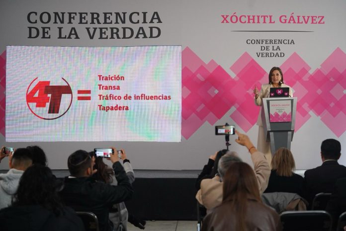 Ciudad de México (ADN/Staff) – En la Conferencia de la Verdad de esta mañana, Xóchitl Gálvez Ruiz, con un tono crítico y directo, desmitificó la promesa del presidente Andrés Manuel López Obrador sobre la erradicación de la corrupción en México. Según Gálvez, la denominada 4T no ha significado una transformación, sino que ha revelado una realidad diferente, marcada por “Traición”, “Transa”, “Tráfico de influencias” y ser “Tapaderas”.