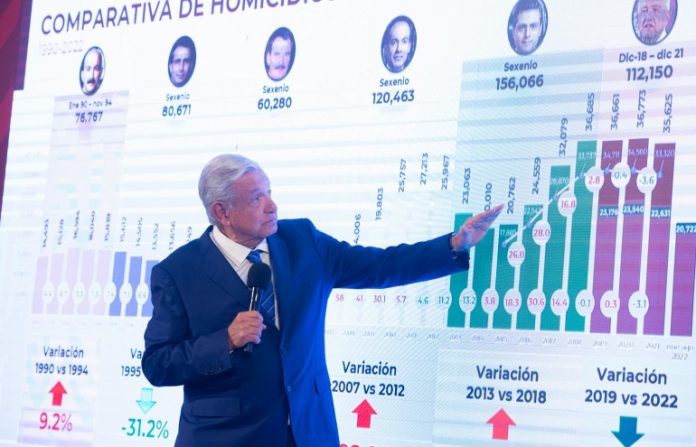 Ante representantes de los medios de comunicación explicó el análisis del promedio de homicidios dolosos por sexenio a partir de datos del Instituto Nacional de Estadística y Geografía (INEGI) y del Secretariado Ejecutivo del Sistema Nacional de Seguridad Pública; de 1990 a agosto de 2022 resalta la disminución de 10.6 por ciento de variación total durante esta administración.