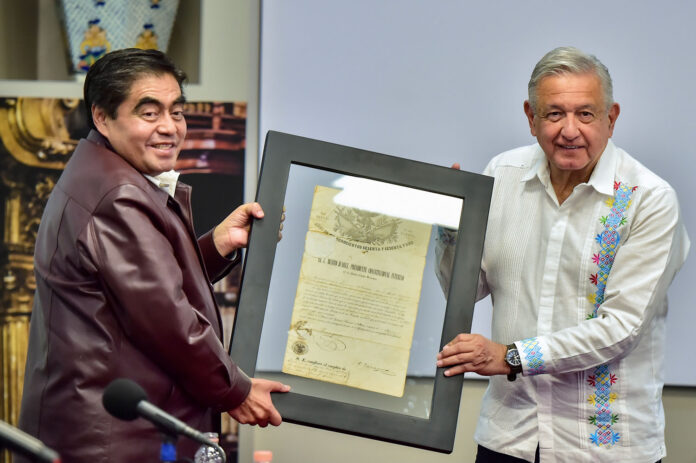 Ciudad de México. – En un mensaje en sus redes sociales, el mandatario informó que recibió del gobernador de la entidad, Miguel Barbosa Huerta, un documento original en el cual, el 1 de mayo de 1861, el presidente Benito Juárez García y el ministro de guerra Ignacio Zaragoza, nombraron subteniente de la Segunda Batería del Batallón de Artilleros a Manuel Cortés.