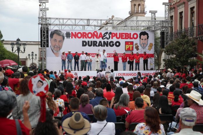 Gerardo Fernández Noroña se proclama como la voz del pueblo en Durango, llegando a la Plaza de Armas en su icónico Noroñabus.