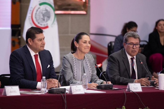 Ciudad de México (ADN/Adriana Saucedo) La jefa de gobierno de la Ciudad de México, Claudia Sheinbaum Pardo, asistió a la Décima Reunión Plenaria del Grupo Parlamentario de Morena en el Senado, encabezada por el coordinador de esa bancada, Ricardo Monreal.
