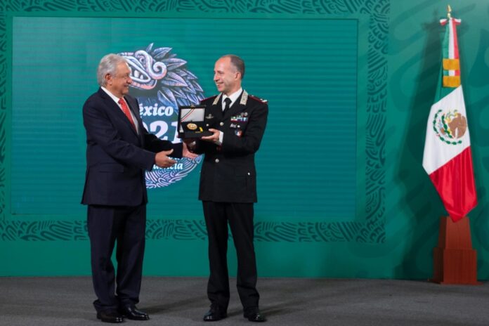 El primer mandatario y el secretario de Relaciones Exteriores, Marcelo Ebrard Casaubon, entregaron la condecoración de la Orden Mexicana del Águila Azteca al Comandante de los Carabineros para la protección del Patrimonio Cultural de Italia, Roberto Riccardi.