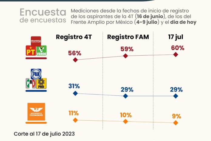 Ciudad Juárez, Chih. (ADN/Staff) – Las últimas tendencias políticas en México están mostrando un patrón interesante, de acuerdo con la Encuesta de Encuestas realizada recientemente por polls.mx Desde el inicio del registro de candidatos tanto de la 4T (Morena-PT-PVEM) como del ‘Frente Amplio por México’ (FAM), los morenistas y sus aliados han logrado un crecimiento significativo en las intenciones de voto, aumentando su popularidad agregada en cuatro puntos porcentuales.