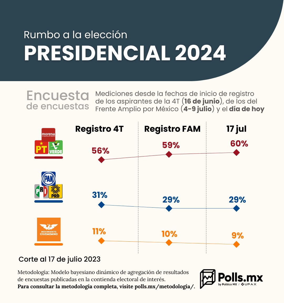 Además, durante el periodo de registro del FAM (del 4 al 9 de julio), las cifras de Morena-PT-PVEM aumentaron un punto porcentual respecto al 16 de junio, mientras que las de FAM y Movimiento Ciudadano disminuyeron en dos y un punto porcentual, respectivamente.