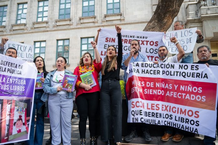 Ciudad de México (ADN/Staff) – Este martes, maestros, padres de familia y la diputada federal Andrea Chávez se presentaron en las puertas de la Suprema Corte de Justicia de la Nación (SCJN) para instar la resolución de la controversia constitucional que ha retrasado la entrega de libros de texto gratuitos en los estados de Chihuahua y Coahuila. Los manifestantes piden al gobierno dejar de utilizar la educación como moneda de cambio en asuntos políticos y económicos.