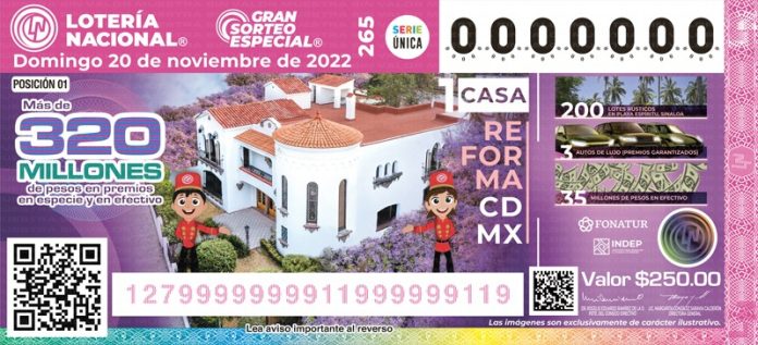 Ciudad de México (ADN / Martín Orquiz) – En el marco del aniversario del inicio de la Revolución Mexicana, el próximo 10 de noviembre el Gobierno Federal realizará el Gran Sorteo Especial 265 para rifar una casa de lujo en en Paseo de la Reforma.