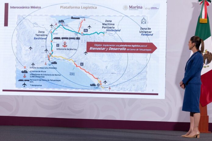 Ciudad Juárez, Chih .- La Presidenta de México, Claudia Sheinbaum Pardo, destacó que el Corredor Interoceánico del Istmo de Tehuantepec va muy avanzado, por lo que se proyecta que sea inaugurado y puesto en operación para el primer semestre del 2026; esto con la conclusión de la Línea K que lleva más del 65 por ciento de avance; las obras de construcción de patios, laderos y la Vía de Penetración Roberto Ayala-Dos Bocas de la Línea FA, así como todos los Polos del Bienestar.