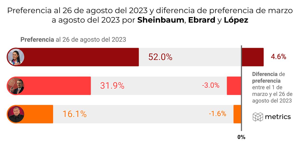 En el periodo estudiado, Claudia Sheinbaum registró un 52.0% de preferencia entre más de 192,000 usuarios de la red social X. Marcelo Ebrard, por otro lado, alcanzó un 31.9% de preferencia, experimentando una caída de 3.0% en el mismo periodo. Adán Augusto López cerró con un 16.1% de preferencia, con un decremento de 1.6%.