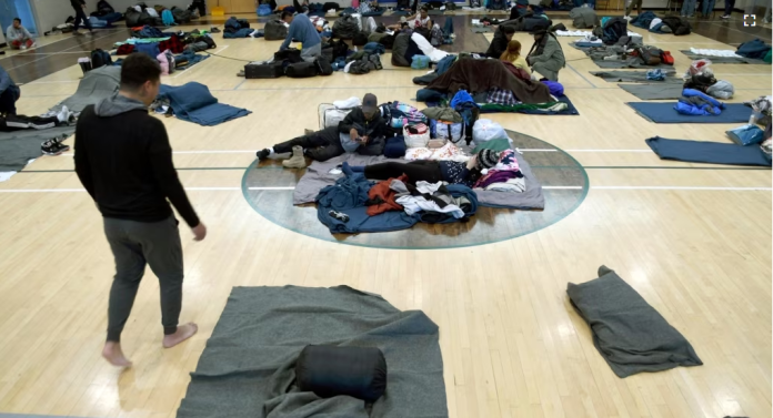 Migrantes duermen en salas de recepción de comisarías en Chicago. En Nueva York, un buque crucero sirve de refugio. En Denver, el número de migrantes se ha decuplicado y el espacio disponible para alojarlos ha desaparecido. A falta de autorizaciones de trabajo, estos migrantes no pueden conseguir empleos que les permitan conseguir viviendas.