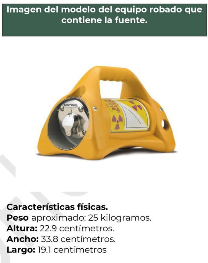 De acuerdo al reporte, la fuente extraviada contiene Iridio-192 y pesa 25 kilogramos aproximadamente.