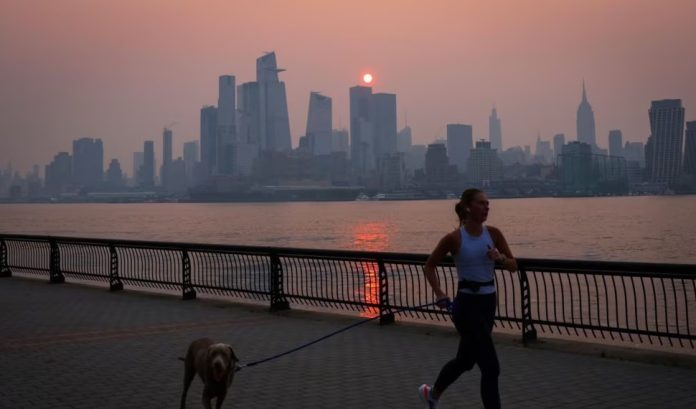 Los efectos de cientos de incendios forestales que ardían en las provincias occidentales hasta Quebec se podían sentir en lugares tan lejanos como la ciudad de Nueva York y Nueva Inglaterra, borrando los horizontes e irritando las gargantas.