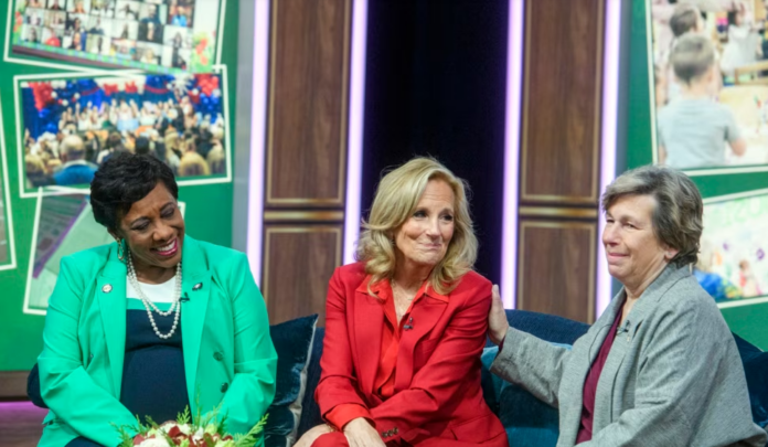 “Siempre amaré esta profesión, razón por la cual continué enseñando a tiempo completo mientras servía como su primera dama”, dijo Jill Biden, quien estuvo acompañada en un sofá por las presidentas de los sindicatos de profesores Randi Weingarten, de la Federación Estadounidense de Maestros y Becky Pringle, de la Asociación Nacional de Educación.